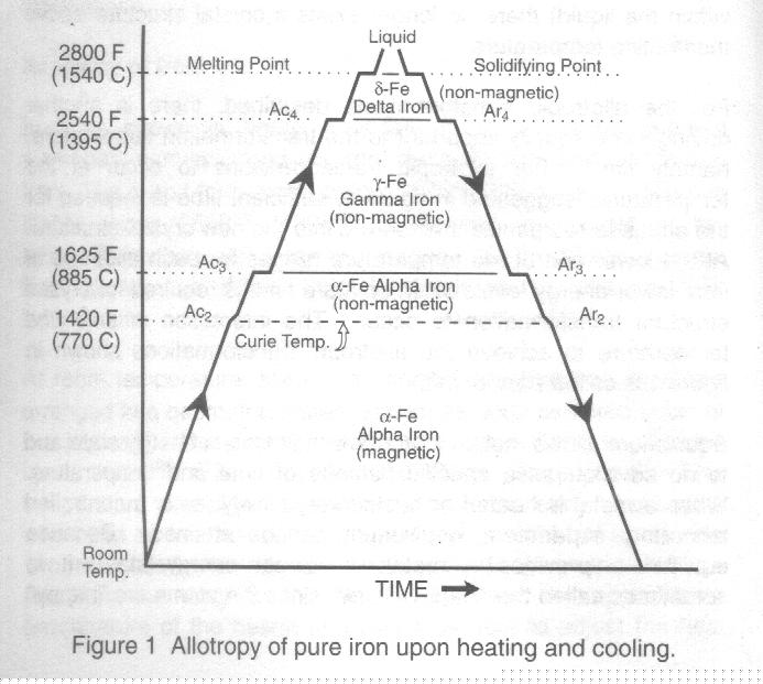 form exists below 1625oF (885oC) while d-iron is stable above 2540oF ( 1395oC). Gamma iron exists at the temperatures between these two ranges. It is the allotropy of iron that allows for these crystal structures to change with temperature.