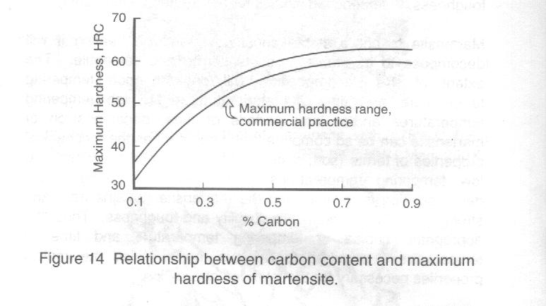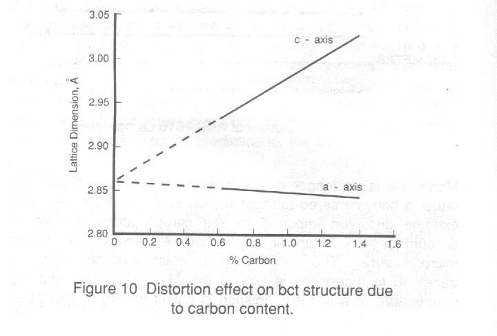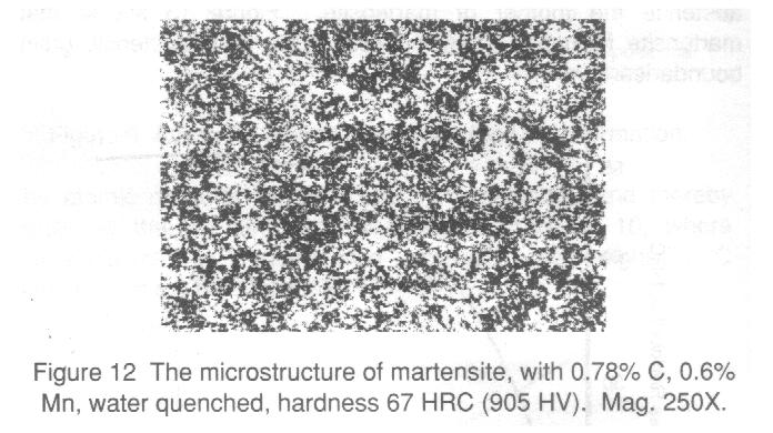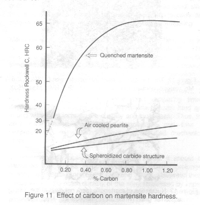nd the temperature at which it is finished is called the Mf temperature. The maximum rate of cooling required to produce 100% martensite is called the critical cooling rate. The atomic proof of carbon's effect on distorting, and thereby hardening the bct structure, is exhibited in figure 10, where increasing carbon content also increases the height or C dimension of the bct structure. One would expect that steels of higher carbon content, being more distorted, would produce martensite of greater hardness, and this is in fact so, as figure 11 demonstrates. Consequently, not all martensitic structures are created equal, with their hardness, tensile strength, wear resistance and other mechanical properties controlled by the steel's carbon content. [ Go to Top ] Martensite is the product of cooling austenite at a rate equal to or faster than the critical coo