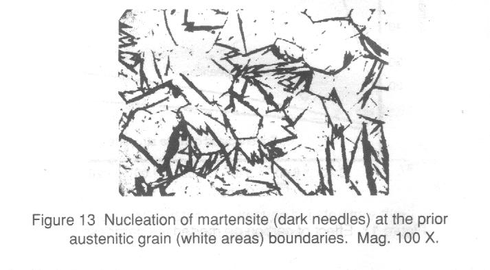 ling rate (figure 12). In order to produce martensite, one has to initially start with austenite, making austenite the mother of martensite. Figure 13 shows that martensite formation often initiates at the prior austenitic grain boundaries. Martensite starts to form on rapid cooling at the Ms temperature. The Ms temperature decreases sharply with increasing carbon content in steels. All other alloying elements, such as Mn, Ni, Cr, Mo, lower the Ms, except for Co which raises the Ms. A significant effect of low Ms temperature is incomplete austenite to martensite transformation at room temperature. Therefore, as-quenched martensitic structure may retain austenite as partnof its room temperature microstructure. If left untransformed, the retain austenite at room temperature becomes an accident waiting to happen. Although martensite can be a very hard, wear resistant, strong material, it lacks ductility, toughness and in all but low-carbon steels it is extremely brittle. Consequently, martensite must be heat treated to enable parts to be used for industrial purposes. Heat treatment reduces the internal strain in the bct structure, thereby increasing ductility and toughness, at some expense to hardness, wear resistance and strength. A steel through-hardened to a martensitic structure is not a satisfactory engineering material for most applications. Despite its potential strength, it lacks ductility and toughness, often to the point where its full strength cannot even be measured since failure is so easily initiated. In order to develop ductility and toughness, the quenched steel is further treated by tempering Martensite is not a stable constituent, and on heating it will decompose to its stable products, ferrite and cementite. The extent of this decomposition will depend upon tempering temperature and time at temperature. At high tempering temperature and/or long periods of time, decomposition of martensite can be so complete that it approaches the mechanical properties of ferrite (soft, ductile,low strength and hardness). At low tempering temperature and/or short tempering times, decomposition is minimal and the nartensite remains hard and strong with slight increases in ductility and toughness. Thus, the appropriate choice of tempering temperature and time at temperature is required to achieve the specified mechanical properties necessary for the intended application. In tempering fully quenched (martensitic) steels, it should be cautioned that a loss in ductility may result from prolonged heating between 500 and 650 oF (260 and 340 oC). Between these temperatures, the notch ductility of the steel (assessed by impact tests) is reduced. This phenomenon is called temper embrittlement or blue brittleness. [ Go to Top ] The effect of all alloying elements is to reduce the rate at which martensite will temper. Thus, at a given tempering temperature, and for a given time, the alloy steel will show a greater hardness than the unalloyed steel. The design of steels and cooling conditions to produce required amounts of martensite are the subject of technology referred to as hardenability. The measure of a steel's ability to harden to depth is its hardenability. Steels with high hardenability are those that require slower cooling rates for martensite formation. However, it is the carbon content of a steel that determines the maximum hardness feasible. The effect of carbon on hardness is demonstrated in figure 14