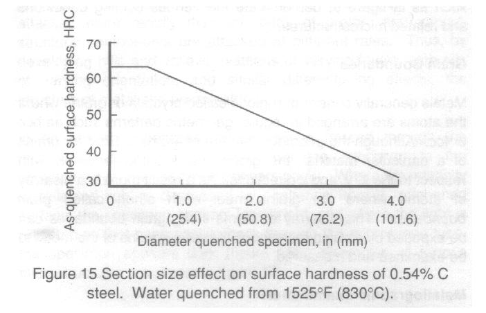 An important factor influencing the maximum hardness that can be achieved is mass of the metal. In a small section, the heat is removed quickly, thus exceeding the critical cooling rate of the steel. As section size increases, it becomes increasingly difficult to remove the heat fast enough to exceed the critical cooling rate and thus avoid formation of nonmartensitic products. An example of the mass effect is shown in figure 15, which illustrates the effect of section size on surface hardness. For small sections up to 0.5 inches (13 mm), full hardness of about 63 HRC is achieved. As the diameter of the quenched piece is increased, cooling rates and hardness decrease because the critical cooling rate for this specific steel was not exceeded. Thus, figure 15 also serves as an example of a low-hardenability steel. Plain carbon steels are characterized by their low hardenability, with critical cooling rates exceeded only in thin sections. Hardenability of all steels is directly related to critical cooling rates. The lower the critical cooling rate, the higher the hardenability for a given steel, almost regardless of carbon contant.