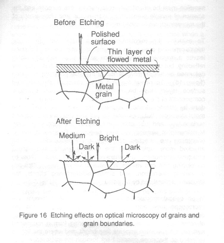 prepared for the purpose and the science of sample preparation, examination and photography of the microstructures is called metallography. To examine the microstructure of a metal with an optical microscope, the area to be examined is first polished. Polishing leaves a mirror-like metal surface which is smooth and highly reflecting, but covered with thin film of metal which is plastically deformed by the abrasive action of the final polishing operation (figure 16). To reveal the true metal structure, the deformed surface layer must be removed. The various structural components of the underlying metal can then be revealed. This is done by etching. Various etchants are used to best reveal the metal structure, but in general the etchants dissolve the distorted surface layer and then attack and dissolve the underlying metal. Metallographic etchants are very selective. Crystals of varying orientation are attacked more rapidly than the body of grains, and various structural components are attacked at different rates. Thus, by developing hills and valleys, plateaus of varying levels, etch pits of varying orientation, and similar differentiating effects, the structure of metal can be revealed. In an optical microscope where light is passed through the microscope tube and reflected from the specimen to the observer's eye, the specimen appears bright. Where the intensity of reflected light is decreased by scattering from a roughened surface, the specimen appears less bright, and where the light is reflected so that none passes back through the microscope tube, the specimen appears dark (figure 16). Examples of ferrous microstructures are shown in figure 17. The grain growth characteristics of hypoeutectoid steels taht have been deoxidized with silicon are said to be normal in that the austenitic grain size increases continuously and progressively as the austenitizing temperature is raised above the A3 temperature. Austenitic grain growth is also time dependent, the grains continuing to grow at any one temperature. The austenitic grain size of annealed or normalized medium carbon steels can readily be observed because proeutectoid ferrite precipitates along the austenitic grain boundaries during slow cooling. Thus bands of ferrite outline pre-existing austenite grain boundaries It is not so easy, however, to recognize the sites of the austenitic grain boundaries in low carbon steels when a large volume fraction of ferrite is present. Similarly, for quenched and tempered steels (martensitic), special etching techniques are required to reveal the prior austenitic grain size. A suggested etchant to reveal prior austenitic grains in steels fully hardened to martensite is 1 g of acid, 5 ml. of HCl and 95 ml. of ethyl alcohol (see ASTM Standard E112 appendix 3 for more details). Grain coarsening of austenite is reversible. Several new grains of austenite can be nucleated in the volume that had been occupied by one former austenite grain, and that the size to which these new grains grows depends primarily on the new austenitizing temperature. Thus the new austenite grain size will generally be smaller than the former grain size if the new austenitizing temperature is lower than the previous one. [ Go to Top ]