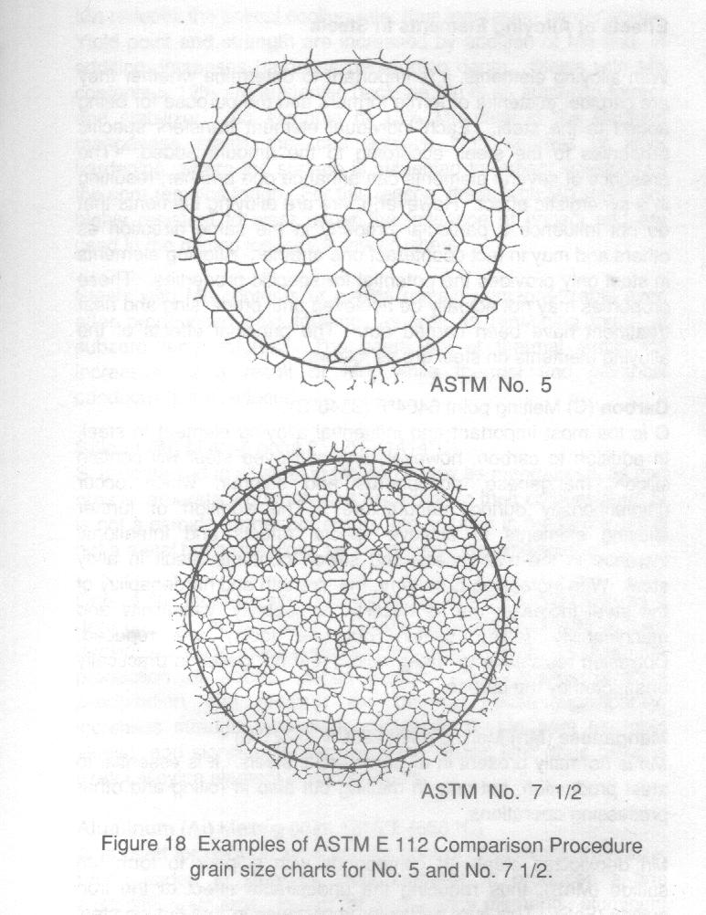 However, a small austenitic grain size is usually not always recovered in a single reaustenitizing heat treatment, depending on the initial size of the grains. For larger grain sizes, several reaustenitizing heat treatments may be required to obtain uniform and small final grain size. Keeping in mind that the lower the austenitizing temperature the greater the grain refinement. Some steels are treated during the steelmaking process with grain refinement alloying elements, such as Al, Nb, V, Ti and Zr, which inhibits austenitic grain growth. The austenitic grain size after heating at normal austenitizing temperatures is then much smaller than for normal steels. The product then is commonly called fine-grained steel. Reducing the ferrite grain size by this or other methods results in increased yield strength, which varies approximately with the reciprocal of the square root of the ferrite grain diameter (d-1/2). Reducing the ferrite grain size also increases the toughness, which is the one factor that improves both the yield strength and toughness simultaneously. For example, many proprieary line pipe steel specifications contain requirement on ferrite grain size to minimize the risk of brittle fracture. Grain size is commonly measured according to ASTM Standard Method E112. Determining The Average Grain Size. This standard lists three methods for determining granin size, namely the comparison Procedure, Planimetric (Jeffrys') Procedure, and Intercept Procedure. Because of their purely geometric basis they are quite independent of the metal concerned and may also be used for the measurement of grain, crystal,or cell size of nonmetallic materials. In materials having two or more constituents, the grain size usually refers to that of the matrix, except that in those materials where a second phase of sufficient amount, size or continuity to be significant, the grain size may be reported separately. Minor constituent phases, inclusions, and additives are not normally considered. It is important in using these methods to recognize that the measurement of grain size is not precise, but an estimate. A metal grain is a three-dimensional shape of varying sizes. The grain cross section produced by random plane (surface of observation) is dependent upon where the plane cuts each individual grain. Thus, no two fields of observation can be exactly equal. The comparison procedure is very popular since it takes the least time to carry out. This method involves viewing grains in a microscope and comparing them at the same magnification, 75X or 100X, to charts defined in ASTM E112, with two examples shown in figure 18. The ASTM Grain Size Number corresponds to a certain number of grain/in2 according to Table 1.