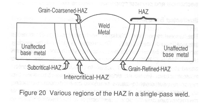 Figure 20 shows a cross section of a single-pass weldment outlining the weld metal and HAZ. Because of varying thermal conditions as a function of distance from the weld interface, the HAZ is actually composed of four distinct regions, namely, the grain-coarsened-HAZ, grain-refined-HAZ, intercritical_HAZ, and subcritical-HAZ. Each of these regions within the HAZ possesses microstructures and associated mechanical and physical properties that make them unique.