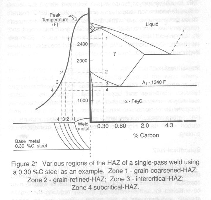 00oF (1350 - 425oC) for carbon steel. With this large temperature gradient comes varying microstructures in steel that will depend on the peak temperature reached, time at temperature, and cooling rate. Consequently, the term "heat affected zone" is really a misnormer when describing it on a metallurgical basis, since the HAZ is really made up of several distinct metallurgical zones.