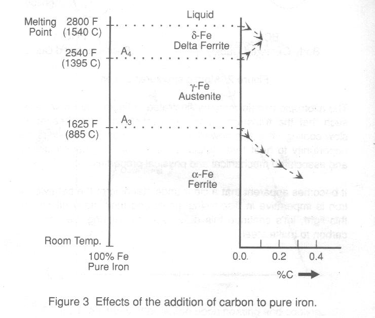 Note in figure 1 that the heating/cooling curve flattens at the allotropic transformation temperatures. This pause in the heating/cooling cycle is necessary for equilibrium allotropic change in the crystal structures to occur. This form of graphical presentation was made popular by French scientists, and consequently, the transformation temperatures are designated by the letter A (from the French word arreter - meaning to stop), or r (from refroidir - meaning to cool). For example, Ac3 is transformation temperature of a-iron to g-iron upon heating and Ar4 is the transformation temperature of d-iron to g-iron upon cooling. The allotropic transformations illustrated in figure 1 are reversible, such taht the transformations can occur upon slow heating or slow cooling. It is this powerful flexibility of iron that provides the opportunity to heat treat steels to many metallurgical conditions and associated mechanical and physical properties. It becomes apparent that a clear understanding of the behaviour of iron is imperative in discussing steels and their many alloys. In this light, let's continue this discussion by alloying the iron with carbon to make steel. THE IRON-IRON CARBIDE SYSTEM - SLOW COOLING Carbon is the most significant alloying element in steel. One of