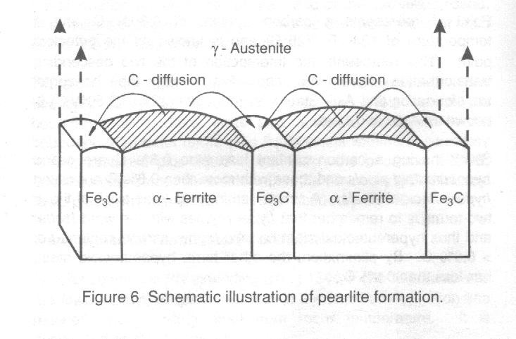 this temperature, austenite will transform to ferrite and cementite. However, the transformation is unique since the carbon previously dissolved in the austenite cannot be retained by the newly formed ferrite, due to the low solubility of carbon in ferrite. Consequently, carbon is rejected by the new ferrite and accumulates as cementite laths (or layars) adjacent to ferrite layers as schematically represented in figure 6. The microstructure of alternating laths of ferrite and cementite is called Pearlite. Eutectoid steels (0.8% C), when slow cooled after austenitizing, will form 100% pearlite (figure 17c). Pearlite was first observed by the 19th century English geologist, Dr. Henry C. Sorby, and was named pearlyte and later pearlite by Professor Howe. Its name is said to be derived from the shiny microscopic appearance resembling that of the mother-of-pearl. [ Go to Top ] The width of the alternating laths of ferrite and cementite govern the mechanical properties of this microstructure. When pearlite is formed under very slow cooling, the pearlite laths are wider than if cooled under relatively faster rates. Pearlite containing wider laths is known as coarse pearlite and is softer and weaker microstructure than pearlite with narrower laths, called fine pearlite. It is important to remember that pearlite is not a phase of steel, but rather a microstructure made up of two phases, namely ferrite and cementite. In terms of understanding the heat treatment of steels, the decomposition of austenite is paramount. Consider austenite in a hypoeutectoid steel of 0.4% C at 1550oF (843oC) and slow cooling (say 100oF/hr) to room temperature. The following observations can be made: 1. Above the A3 line, austenite is stable and can easily dissolve the 0.4% C into its fcc solid solution. Be aware that the higher the austenitizing temperature reached above the A3 line and/or the longer the time at the austenitizing temperature, the larger the austenite grain size will become. This is called grain growth. 2. Upon cooling the fcc austenite from 1550oF (843oC), it begins to transform to bcc ferrite at the A3 temperature, approximately 1475oF (802oC). This phase transformation of austenite to ferrite continues as we cool within PGHP (figure 4) region. Note that as the temperature is decreased within this region, more ferrite is formed at the expense of losing austenite. Since ferrite can dissolve no more than a maximum of 0.025% C, the carbon content of the remaining (untransformed) austenite is increased as proeutectoid (new) ferrite is formed. This continues until just above the A1 line where the remaining austenite will contain essentially 0.8% C. 3. At the A1 line, 1340oF (725oC), the remaining austenite begins its transformation to pearlite. As the A1 line is crossed, the remaining austenite transform to pearlite and the resultant microstructure is a mixture of ferrite and pearlite. 4. Cooling from just below the A1 line, where ferrite and pearlite are now present, produces no further phase changes. The room temperature microstructure will remain ferrite and pearlite. Ferrite grain size and pearlite volume fraction are a key factor in determining low temperature impact toughness. The smaller the final grain size and the lower the pearlite amount, the higher the low temperature impact toughness will become. Consider austenitizing a hypereutectoid steel of 1.0% C at 1550oF (843oC) followed by slow cooling (say 100oF/hr). The following observations can be made: 1. Above the Acm line, austenite is stable and can easily dissolve the 1.0% C. Again, the higher the temperature reached above the Acm line and/or the longer the time at that temperature, the larger the austenite grain will become. Also remember that to achieve an austenitizing condition, sufficient time at the austenitizing temperature is required to produce 100% austenite through the thickness of the steel part. 2. As the Acm temperature, about 1450oF (787oC), is met upon cooling, austenite begins to give up (called precipitation) some of its carbon, thus forming the new phase, cementite (Fe3C). The amount of austenite decreases as new cementite is formed, with decreasing temperature approaching the A1 line. 3. At the A1 line, 1340oF (72oC), sufficient carbon has been precipitated from the austenite solid solution that it now retains only 0.8% C. This is the eutectoid composition, and hence, the remaining austenite transforms to pearlite upon further cooling. 4. Once the A1 line has been crossed, the resultant microstructure consists of cementite and pearlite. Cementite is peresent within the pearlite or as a network around the pearlite grains (see figure 17c and e). There are no further phase changes as the steel cools to room temperature. Eutectic and Eutectoid Reactions It is important to distinguish between the eutectoid and eutectic reactions in the iron - carbon system. The eutectoid reaction at 0.8 and 1340oF (725oC) involves one solid solution phase (austenite) transforming on cooling to a mixture of two solid solution phases (ferrite + cementite). By comparison, the eutectic reaction at 4.3% C and 2100oF (1150oC) involves one liquid phase transforming on cooling into a mixture of two solid solution phases (ledeburite and cementite). Fe-Fe3C Phase Diagram Reactions [ Go to Top ] Industrial fabrication conditions restrict the application of the iron-iron carbide phase diagram, since: 1. Commercial additions of other elements (Mn, Si, Cr, Ni, Mo, etc.) shiftnthe position of the transformation lines, i.e. changing the transformation temperatures, with the extent of the change depending on the element and the amount added. 2. Faster rates of heating annd cooling, such as in welding and quenching, greatly exceed the equilibrium rates (i.e. slow cooling and cooling), so that the transformation reactions are shifted, delayed, or simply do not have sufficient time to occur. However, the diagram can be used in many industrial heat treatment applica