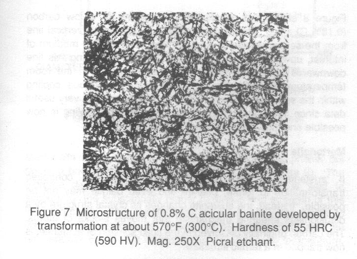 Upper bainite is rather featherly-appearing microstructure, while lower bainite is much more acicular (figure 7), resembling its close cousin, tempered martensite. Since bainite structures are composed of iron carbide and ferrite, often supersaturated with carbon, the distinction between upper and lower bainite is significant considering there can be major differences in mechanical properties. For the most part, bainite is harder, stronger and tougher at low temperatures than ferrite-pearlite or stright pearlitic microstructures, in steels of equivalent carbon contents. This microstructural interpretation becomes important when attempting to resolve failure mechanisms involving these steels in H2S gas (sour) environments. Unfortunately however, it can be extremely difficult to distinguish a steel microstructure as upper or lower bainite, and even at times with martensite. Bainite is not referenced in the Fe-Fe3C phase disgram since its production involves faster cooling rates than those allowed for in this phase diagram. To predict the formation of bainite upon cooling from austenite, other diagrams must be used, specifically, isothermal transformation (ITT) diagrams, sometimes called time-temperature transformation (TTT) diagrams. These diagrams involve isothermal cooling, meaning cooling at a c
