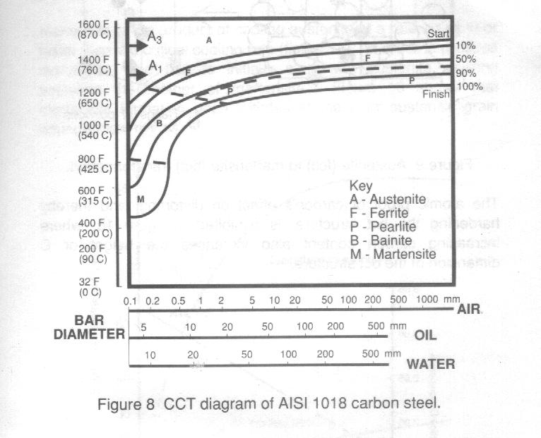 onstant (iso) temperature (thermal). Bain and his associates created many ITT diagrams for steel, though they have limited direct use in industrial applications since isothermal cooling conditions are rarely used outside the laboratory. However, modified ITT diagrams to accommodate continuous cooling conditions are useful for commercial practice. The most functional diagrams of this type are the modified continuous cooling transformation (CCT) diagram for engineering steels,of which a popular series was produced under the direction of M. Atkins of the British Steel Corporation. [ Go to Top ] Figure 8 shows the modified CCT diagram for a low carbon (0.18% C) steel. The diagram is read by drawing a vertical line from the section thickness (bar diameter) and cooling medium of interest, upwards to the top of the diagram. Following this line downwards from the A (austenite) region results in the room temperature microstructure produced upon continuous cooling within the selected medium. This information provides very useful data since microstructure prediction for industrial cooling is now possible and thus, properly prediction for the steel. If austenite is very rapidly cooled, diffusion ocntrolled transformation to ferrite, pearlite and even bainite may not be possible. Instead, the austenite changes its crystal structure by a diffusionless shearing mechanism that moves blocks of a