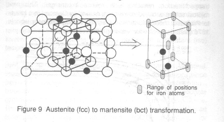 toms. The carbon originally dissolved in the solid solution of austenite,is now trapped in a ferrite structure. Since ferrite has an extremely low solubility of carbon, its crystal structure becomes distorted to accommodate the presence of the trapped carbon, resulting in a volume expansion. This new microstructure is called martensite, named by Osmond in a tribute to Professor Adolf Martens, a German railway engineer who in 1878 started a center for metallographic research. Martensite is no longer a true body-centered cubic phase, but rather a body-centered tetragonal (bct) structure (figure 9). The extreme distortion imposed by the carbon atoms is said to account for the substantially higher hardness and strength of this microstructure. The temperature at which austenite starts to transform to martensite is termed the Ms temperature a